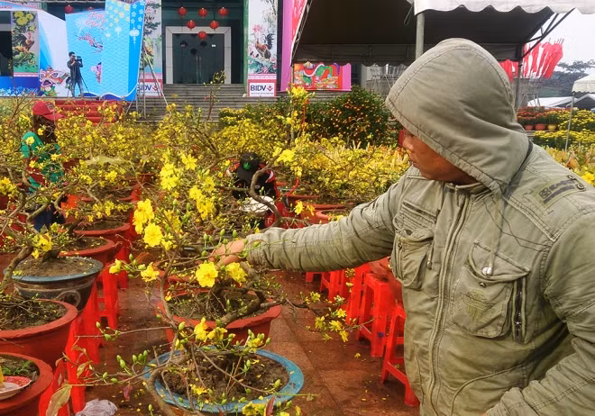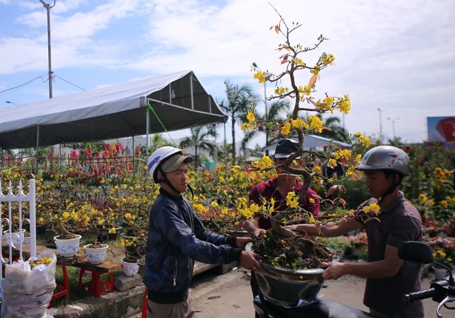 Cây mai này được bán với giá 1,4 triệu đồng. Khách mua cho biết do thời tiết miền Trung năm nay khắc nghiệt nên có được cây mai nhiều nụ và hoa là mừng, không tính toán nhiều đến giá cả.