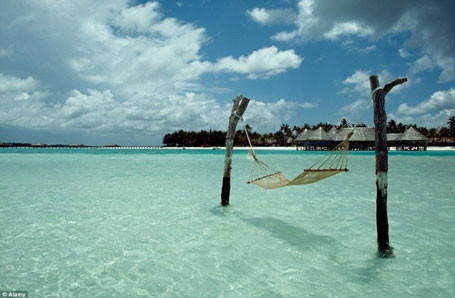 Du khách có thể tắm nắng trên chiếc võng được cột giữa dòng nước biển màu xanh ngọc lam