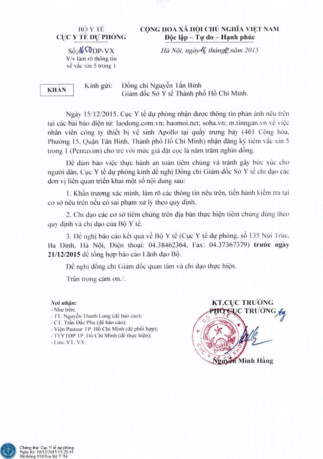 Ngày 16/12/2015, Cục Y tế dự phòng đã có công văn số 1650/DP-VX đề nghị Sở Y tế TP. Hồ Chí Minh chỉ đạo các đơn vị liên quan khẩn trương xác minh, làm rõ các thông tin trên các trang báo nêu trên, tiên hành kiểm tra tại các cơ sở được nêu và xử lý sai phạm nếu có; đồng thời chỉ đạo các cơ sở tiêm chủng trên địa bàn thực hiện tiêm chúng đúng theo qui định và chỉ đạo của Bộ Y tế.