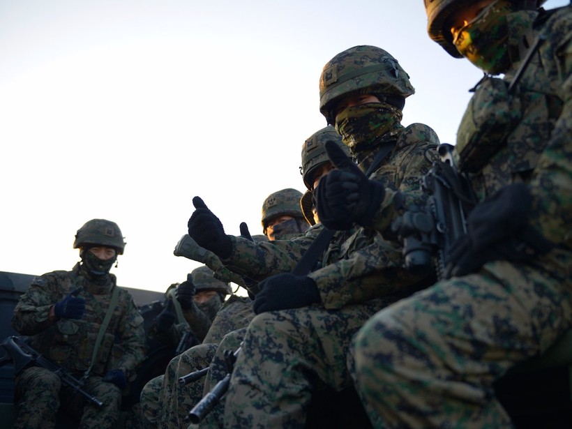 Các binh sĩ Hàn Quốc đang trên xe tới căn cứ không quân Osan để đổi ca.