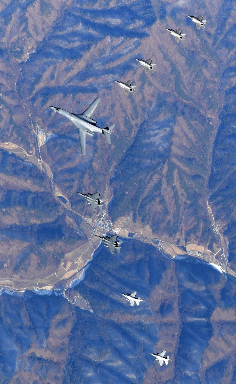 Một chiếc B-1 được hộ tống bởi 2 chiếc F-16, 2 chiếc F-15 và 4 chiếc F-35.