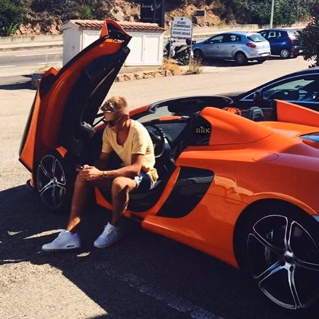 Thiếu gia Nga mải mê dùng điện thoại khi ngồi cùng chiếc siêu xe McLaren 650S Spider màu cam rực rỡ.