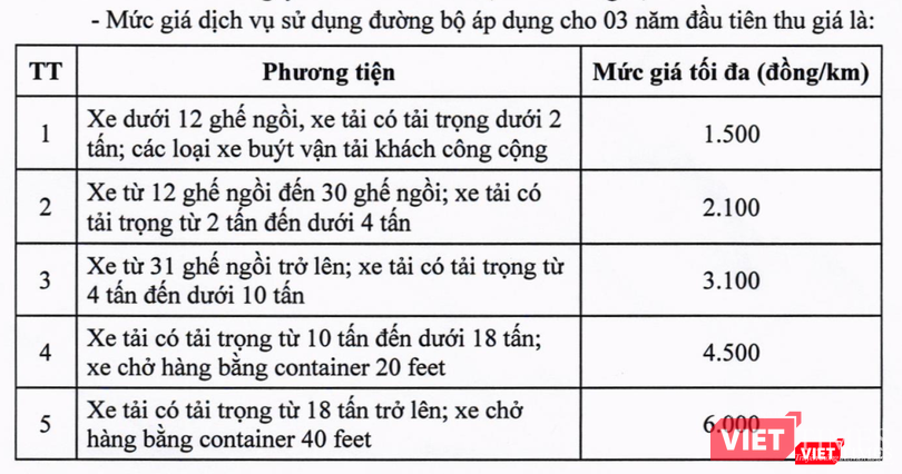 Quyết định cũng nêu cụ thể về mức giá dụng dịch vụ sử dụng đường bộ áp dụng cho 03 năm đầu tiên thu giá. Trong đó mức giá tối đa là 6.000 đồng/km, áp dụng cho xe tải có tải trọng từ 18 tấn trở lên; xe chở hàng bằng container 40 feet.
