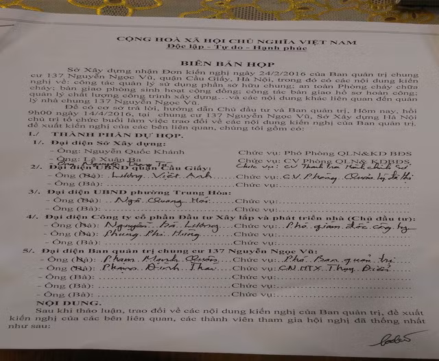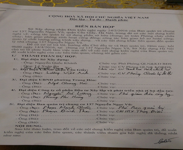 Đại diện đơn vị chủ đầu tư có ông Nguyễn Bá Lượng Phó GĐ Công ty CP Đầu tư Xấy lắp và Phát triển nhà. Đại diện BQT chung cư có ông Phạm Mạnh Quân Phó BQT chung cư 137 Nguyễn Ngọc Vũ.