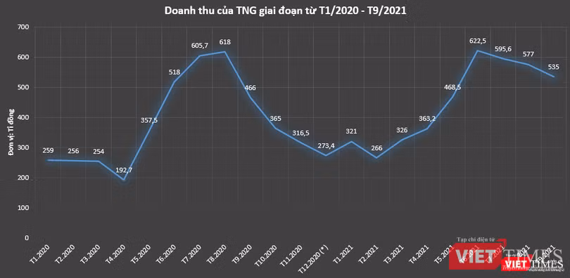 Riêng trong tháng 9/2021, doanh thu của TNG đạt 535 tỉ đồng, tăng 15% so với cùng kỳ. Tuy nhiên, đây cũng là tháng thứ 3 liên tiếp doanh thu của TNG sụt giảm kể từ khi lập đỉnh vào tháng 6/2021. Chỉ tiêu này của TNG trước đó đã có 2 quý tăng trưởng liên tiếp.