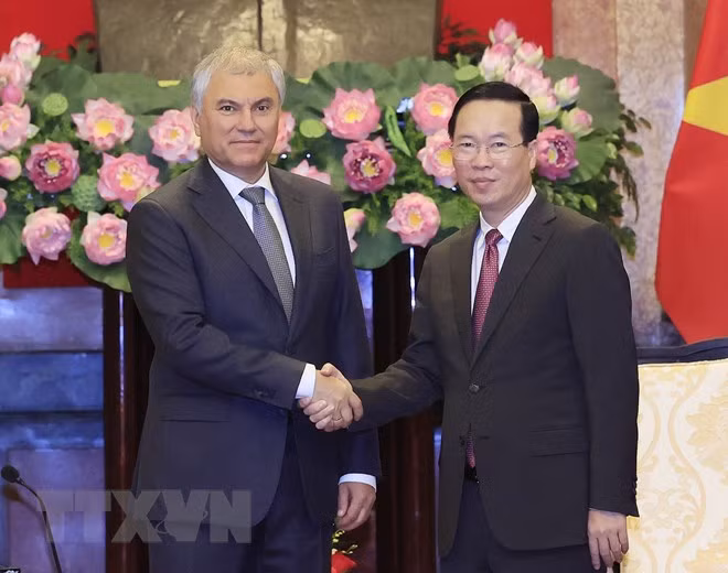Chủ tịch nước Võ Văn Thưởng tiếp Chủ tịch Duma Quốc gia NgaVyacheslav Viktorovich Volodin. (Ảnh: Thống Nhất/TTXVN)