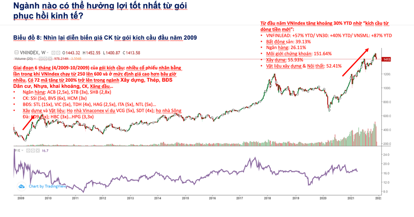 Và dù đã được "kích cầu" bởi dòng tiền mới, tài khoản mới thì duy chỉ có cổ phiếu ngành chứng khoán là tăng bằng lần (151,64%) từ đầu năm), còn lại các ngành vốn được kỳ vọng đều chưa tăng mạnh "bằng lần": Bất động sản: 39,13%; Ngân hàng: 26,11%; Xây dựng: 55,93%; Vật liệu xây dựng & Nội thất: 52,41%...