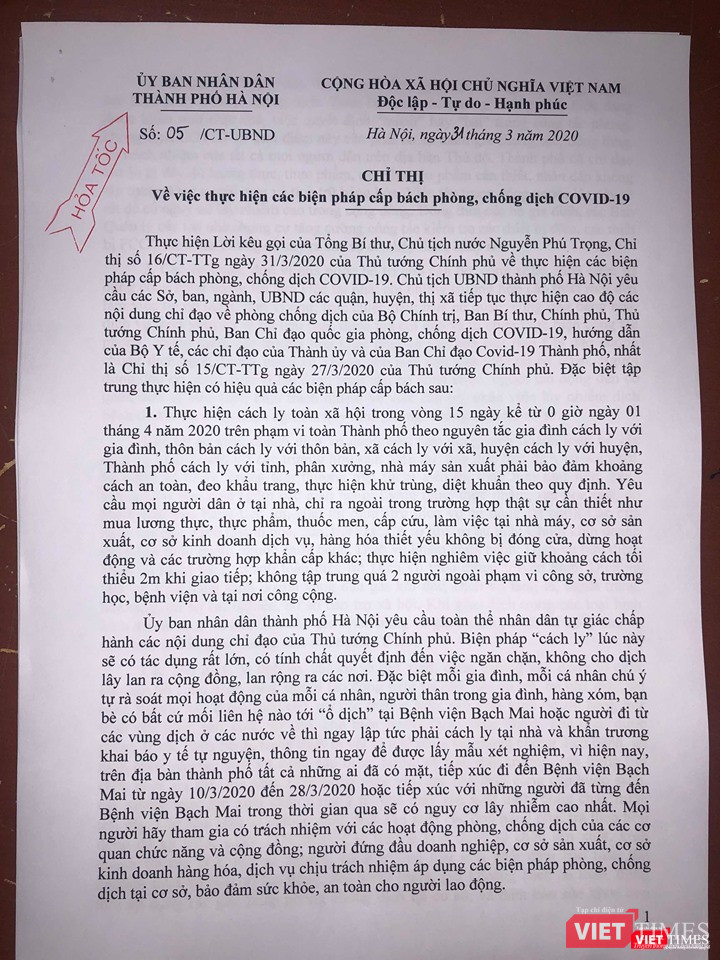 Thực hiện Lời kêu gọi của Tổng Bí thư, Chủ tịch nước Nguyễn Phú Trọng, Chỉ thị của Thủ tướng Chính phủ về thực hiện các biện pháp cấp bách phòng, chống dịch COVID-19, Chủ tịch UBND TP. Hà Nội yêu cầu các Sở, ban, ngành, UBND các quận, huyện, thị xã tập trung thực hiện có hiệu quả các biện pháp cấp bách sau: