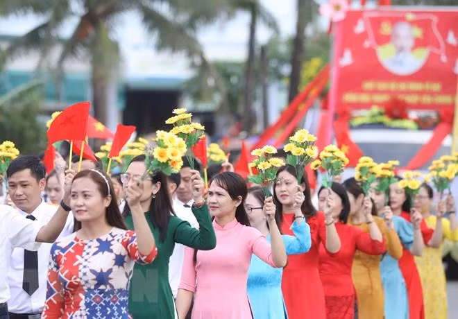 Trong không khí trang nghiêm, trên nền nhạc Quốc ca hào hùng khi lá cờ đỏ sao vàng được kéo dần lên trên kỳ đài Hiền Lương