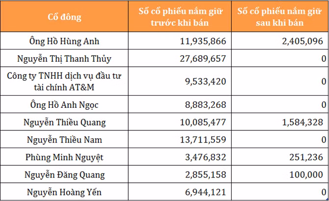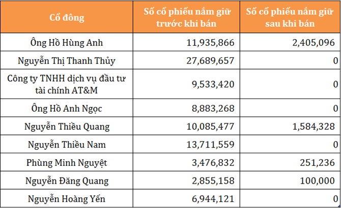 Vợ ông Nguyễn Thiều Quang là bà Phùng Minh Nguyệt đăng ký bán bán 3.225.596 cổ phiếu chiếm 0,3633% vốn điều lệ. Ông Nguyễn Thiều Nam, em trai ông Nguyễn Thiều Quang đăng kí bán 10.085.477 cổ phiếu, chiếm 1,1360% vốn điều lệ.