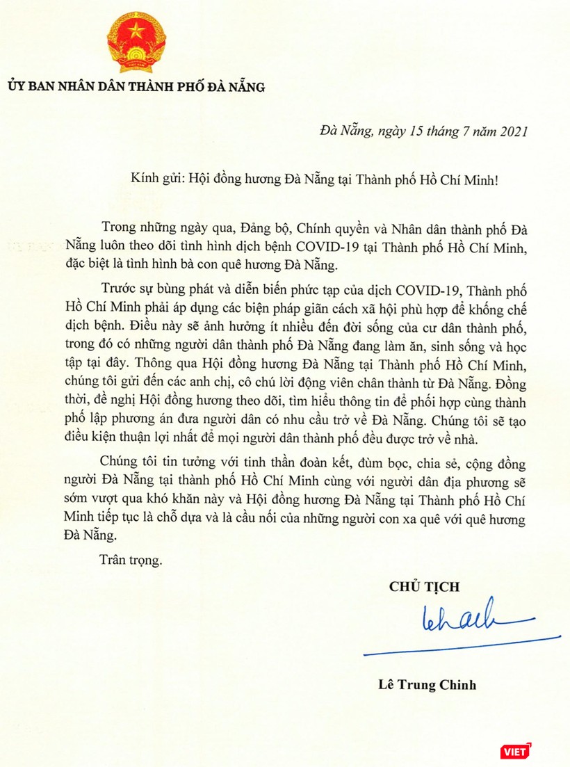 | Bức thư của ông Lê Trung Chinh - Chủ tịch UBND TP Đà Nẵng gửi bà con Đà Nẵng tại TP HCM |