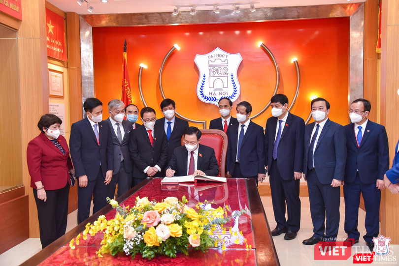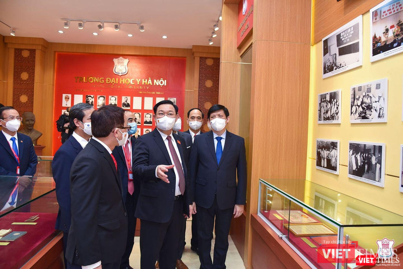 Phát biểu tại buổi lễ, Chủ tịch Quốc hội Vương Đình Huệ bày tỏ niềm xúc động sâu sắc khi biết ông là Chủ tịch Quốc hội đầu tiên đến thăm Trường và lý do ông “xin” đến thăm Trường: Với mô hình Trường - Viện, các thầy cô vừa là thầy giáo, vừa là thầy thuốc, đặc biệt, trong công cuộc phòng, chống dịch COVID-19, thầy và trò nhà trường còn là những chiến sĩ áo trắng xuất sắc.