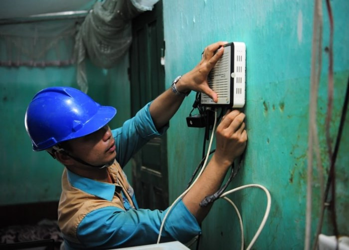 Nhân viên kỹ thuật Nguyễn Đắc Bằng, Viettel huyện Thanh Sơn đang thay thế thiết bị cho một gia đình tại phố Hoành Sơn, thị trấn Thanh Sơn