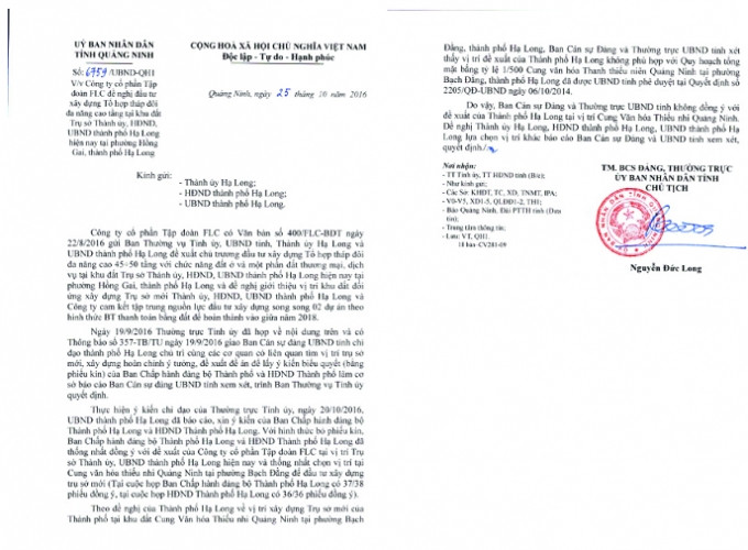Thực hiện ý kiến chỉ đạo của Thường trực tỉnh ủy, ngày 20/10/2016 UBND TP Hạ Long đã báo cáo, xin ý kiến của Ban chấp hành Đảng bộ TP Hạ Long và HĐND TP Hạ Long với hình thức bỏ phiếu kín. Ban chấp hành Đảng bộ UBND TP Hạ Long và HĐND TP Hạ Long đã thống nhất đề xuất của Công ty Cổ phần Tập đoàn FLC tại vị trí trụ sở Thành ủy, UBND TP Hạ Long hiện nay và thống nhất chọn vị trí tại Cung văn hóa Thiếu nhi Quảng Ninh tại phường Bạch Đằng để đầu tư xây dựng trụ sở mới. Tại cuộc họp Ban chấp hành Đảng bộ thành phố Hạ Long có 37/38 phiếu đồng ý, tại cuộc họp HĐND thành phố Hạ Long có 36/36 phiếu đồng ý với đề xuất này.