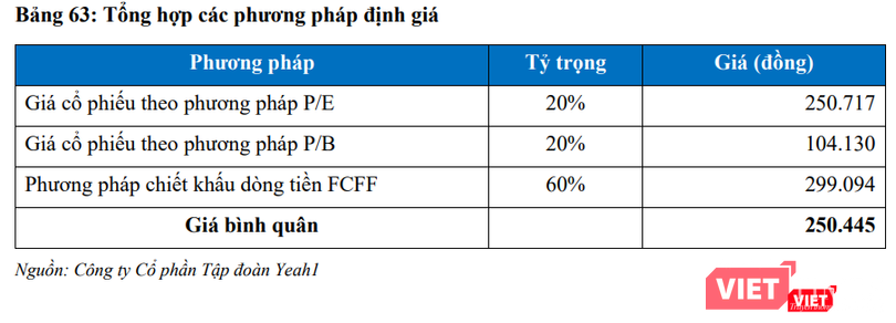 Tổng hợp 3 phương pháp trên, trong đó phương pháp chiết khấu dòng tiền (FCFF) chiếm trọng số lớn nhất với 60%, mức giá bình quân cho mỗi cổ phiếu YEG là 250.445 đồng. HĐQT của YEG, như đã biết, đã chọn mức giá tham chiếu trong ngày giao dịch đầu tiên là 250.000 đồng/cổ phiếu.