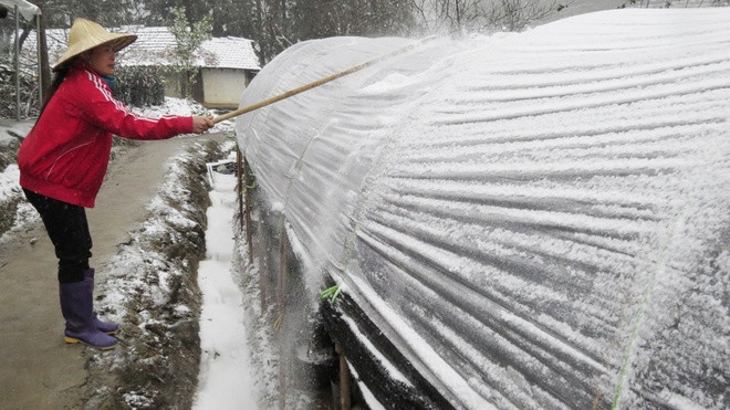 Nông dân Sa Pa đập cho tuyết rơi khỏi mái che bằng nylon để bảo vệ hàng nghìn gốc hoa ly chuẩn bị đến ngày thu hoạch.