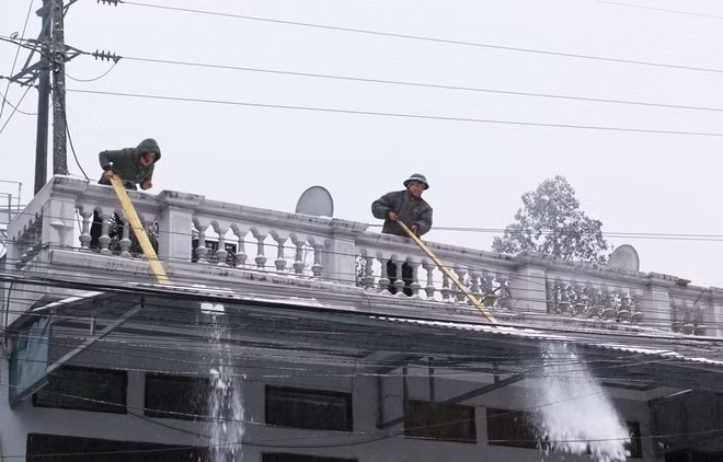 Tuyết rơi dày đặc trên mái nhà khiến người dân phải thường xuyên gạt xuống. Có gia đình còn dùng vòi phun nước nóng lên mái nhà với mục đích làm tuyết nhanh tan.