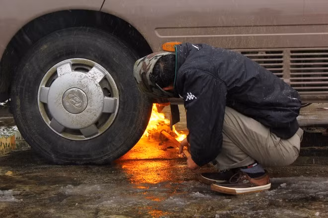 Chiếc xe để ngoài trời vì quá lạnh máy không thể khởi động. Tài xế phải dùng đuốc "đốt" gầm làm nóng nhiên liệu rồi mới khởi động được xe.