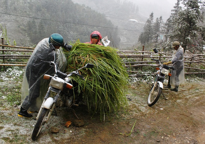 Vợ chồng người Mông tranh thủ đi cắt cỏ về dự trữ vì sợ lớp tuyết dày phủ kín không còn cỏ cho trâu bò ăn.