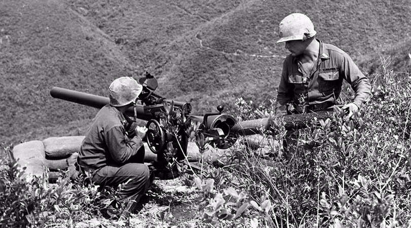 Lực lượng triển khai ban đầu được giới hạn nghiêm ngặt về phương thức tác chiến và chỉ thực hiện nhiệm vụ phòng thủ, mệnh lệnh từ Bộ tổng tham mưu trưởng liên quân xác định "các lực lượng Hải quân Hoa Kỳ sẽ không tham gia vào các trận đánh tấn công VC trong thời gian kế tiếp." Trong hình là hoàn thành việc xây dựng trận địa bazooka gần bãi biển ngày D-Day. (USMC)