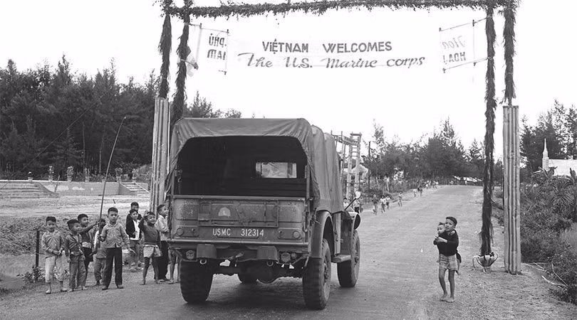 Chính quyền Sài Gòn đã tổ chức cho các học sinh địa phương chào đón lực lượng viễn chinh đến Đà nẵng - Việt Nam, băng cờ khẩu hiệu dăng trên những tuyến đường hành quân. Trong hình, cổng chào với khẩu hiệu "Chào mừng đến Việt Nam", trẻ em địa phương tò mò và hiếu kỳ nhìn ngắm những xe quân sự Mỹ ở ngoại ô Đà Nẵng. (USMC)