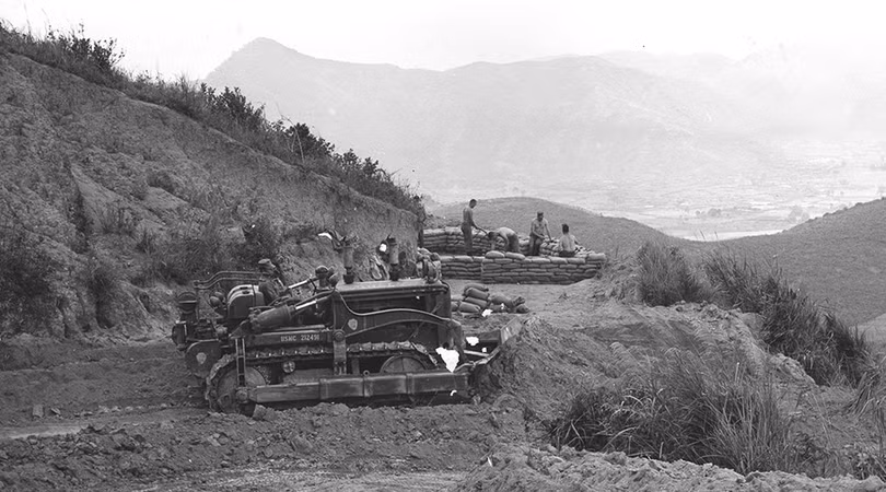Một chiếc xe ủi hạng nhẹ đang mở đường vào vị trí phòng ngự trên đồi 327. (USMC)