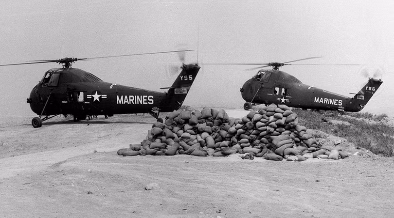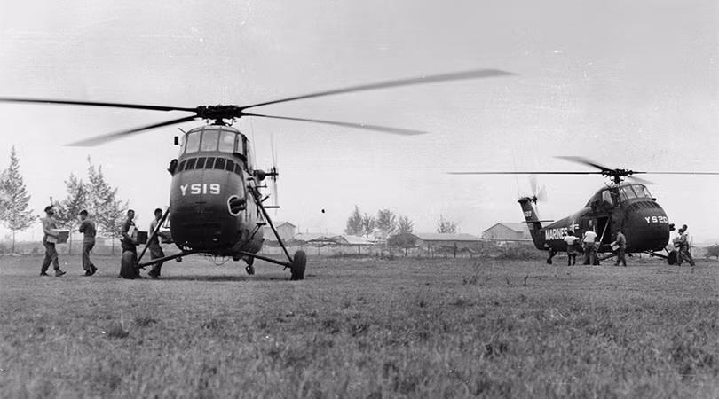 Lính thủy đánh bộ chất hàng lên hai chiếc trực thăng vận tải tại sân bay Đà Nẵng