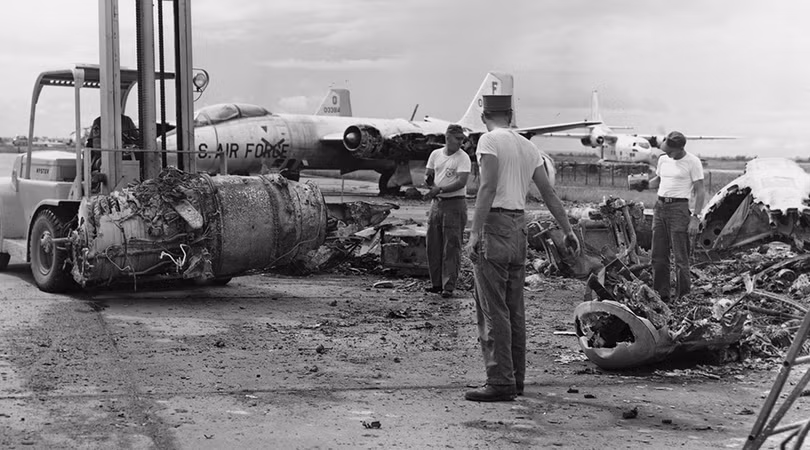 Căn cứ và sân bay của Mỹ trở thành mục tiêu tấn công thường xuyên của quân Giải phóng Miền Nam Việt Nam. Trong ảnh là kết quả của một vụ pháo kích của Quân Giải phóng vào căn cứ không quân Biên Hòa 11. 1964; bốn quân nhân Mỹ thiệt mạng , một số máy bay bị phá hủy. (Ảnh: USAF)
