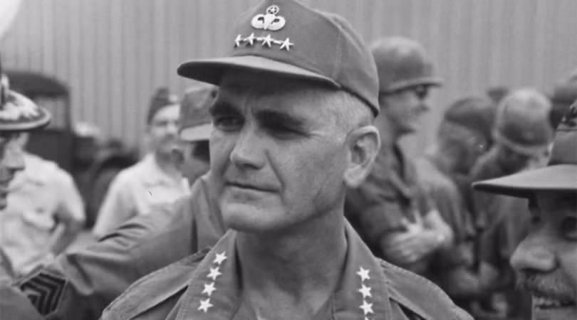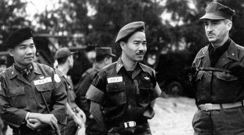 Chuẩn Tướng Frederick K. Karch (bên phải), chỉ huy trưởng lực lượnglữ đoàn 9 Thủy quân Lục chiến Mỹ bàn bạc ngay trên bãi biển với các tướng quân đội Sài Gòn Thi và Lâm ngay trong khi đổ bộ. (USMC)