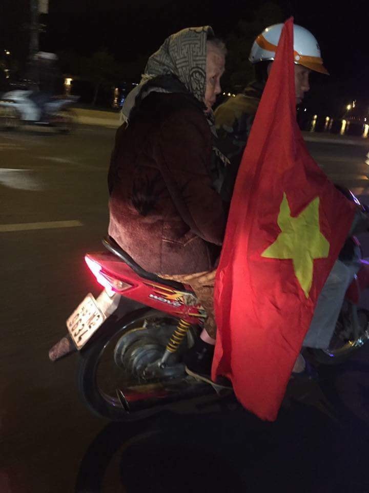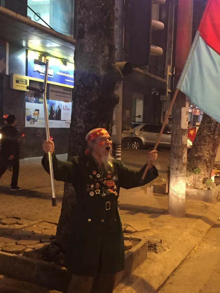 Hình ảnh người cựu chiến binh ăn mừng chiến thắng của U23 VIệt Nam, như ngày mà người lính này cầm cờ Mặt trận Dân tộc giải phóng miền Nam Việt Nam tiến vào Sài Gòn.