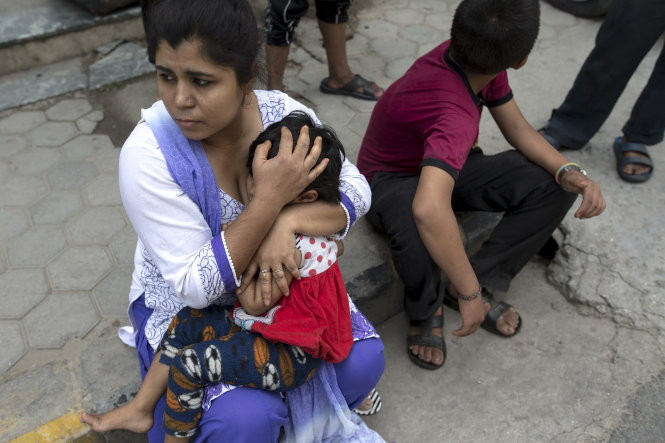 Một bà mẹ ôm chặt đứa con sợ hãi khóc nức nở ở Kathmandu - Ảnh: Reuters