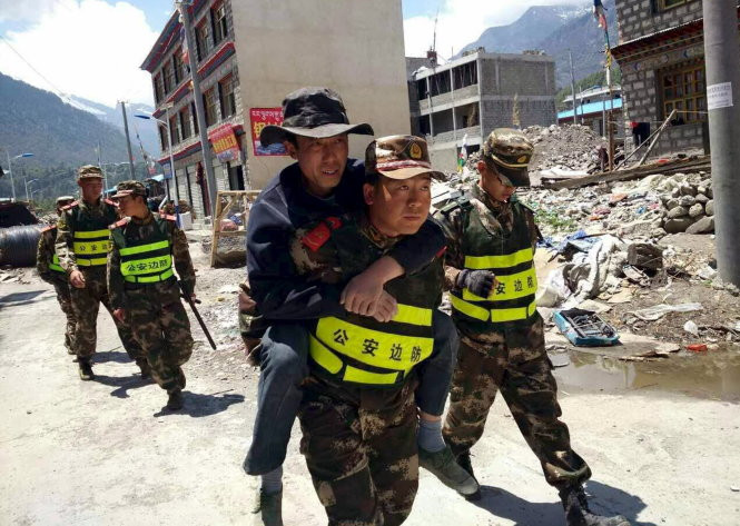 Một người đàn ông Tây Tạng bị thương được nhân viên cứu hộ cõng đi. Động đất cũng gây phá hủy và chết người tại Tây Tạng - Ảnh: Reuters