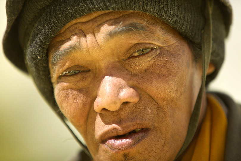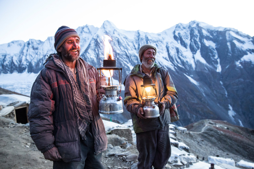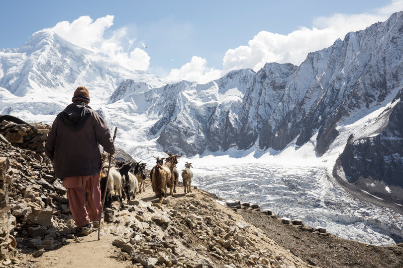 Trong bức ảnh này, một nhà cung cấp thịt mang dê lên cho các thợ mỏ đá quý. Bởi vì độ cao, tất cả các vật tư và thiết bị phải được đưa vào từ các làng và thung lũng bên dưới.