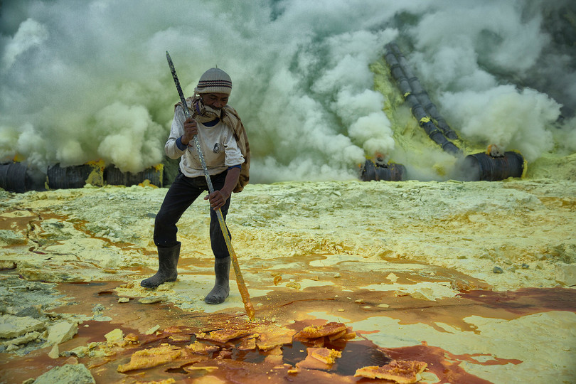 1. Thợ mỏ lưu huỳnh ở Indonesia làm việc bên trong một ngọn núi lửa còn hoạt động, họ phải vác theo 70 kg lưu huỳnh đi 2.5 km ra khỏi núi lửa, và sau đó hơn 3 km xuống núi đến một trạm cân.