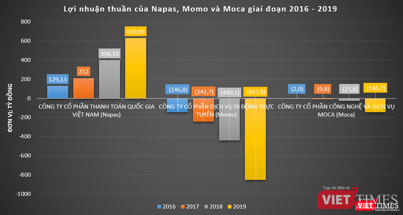 Lĩnh vực thanh toán điện tử tiềm năng là vậy, song, không phải đơn vị trung gian thanh toán nào cũng có kết quả kinh doanh khả quan. Dữ liệu của VietTimes cho thấy, Napas là đơn vị hiếm hoi có lãi trong 4 năm gần nhất, kết quả kinh doanh “sáng” hơn nhiều so với các ví điện tử Momo, ZaloPay hay Moca.