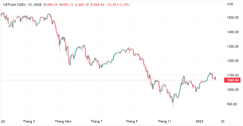 Kết thúc phiên giao dịch hôm nay (7/2), VN-Index giảm 23,45 điểm (-2,15%) xuống 1.065,84 điểm; HNX-Index giảm 4,47 điểm (-2,08%) xuống 210 điểm. Toàn thị trường (HOSE, HNX và UPCoM) ghi nhận 611 mã giảm, 212 mã tăng và 176 mã tham chiếu.