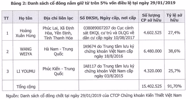 Về phía cổ đông trong nước, đa số cổ phần do ông Hoàng Xuân Hùng nắm giữ với tỷ lệ sở hữu đạt 27,4%. Số cổ phần còn lại do 154 cổ đông tổ chức và cá nhân khác nắm giữ.