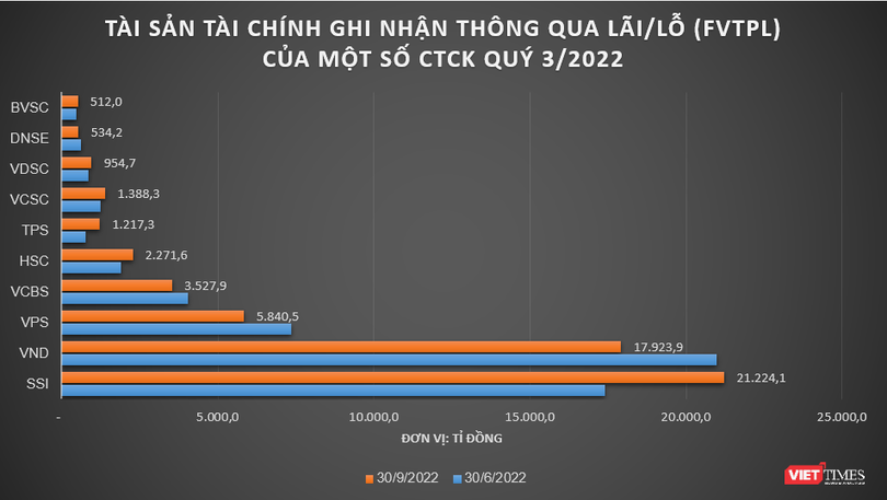 Tính đến cuối quý 3/2022, giá trị hợp lý các tài sản tài chính ghi nhận thông qua lãi/lỗ (FVTPL) ở hầu hết các CTCK mà VietTimes khảo sát đều đang giảm sâu so với giá gốc.