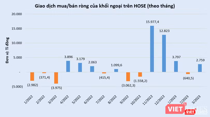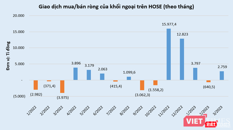 Lũy kế cả tháng 3/2022, khối ngoại mua ròng 2.759 tỉ đồng trên HOSE. Tính riêng giao dịch khớp lệnh họ mua ròng 2.722 tỉ đồng, tập trung vào các mã HSG (+693,2 tỉ đồng), VHM (+545,4 tỉ đồng), POW (+504,8 tỉ đồng), SHB (+274,9 tỉ đồng).