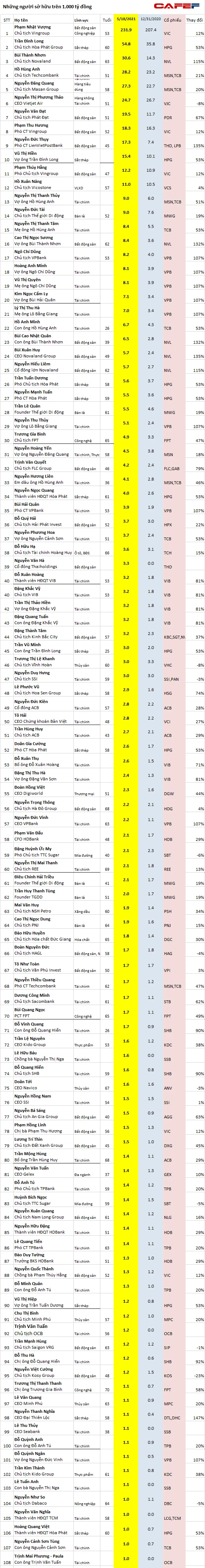Trên thực tế theo thông tin người viết có được vẫn còn rất nhiều người sở nhiều nhiều nghìn tỷ đồng tại những doanh nghiệp vốn hóa tốp đầu như Vingroup, Novaland, TCB, VPBank… nhưng không bao giờ xuất hiện do tỷ lệ nắm giữ dưới 5% và/hoặc không giữ chức vụ, không phải là người có liên quan đến cổ đông nội bộ.