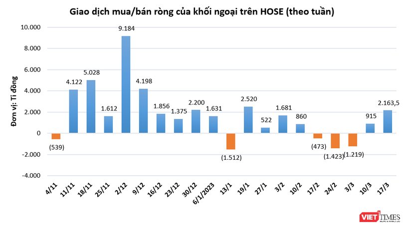 Trong tuần vừa qua, dưới ảnh hưởng tích cực của quỹ Fubon, khối ngoại duy trì mua ròng trên sàn HOSE, với giá trị mua đạt 9.676,9 tỉ đồng, giá trị bán 7.513,3 tỉ đồng, tương ứng giá trị mua ròng 2.163,5 tỉ đồng.