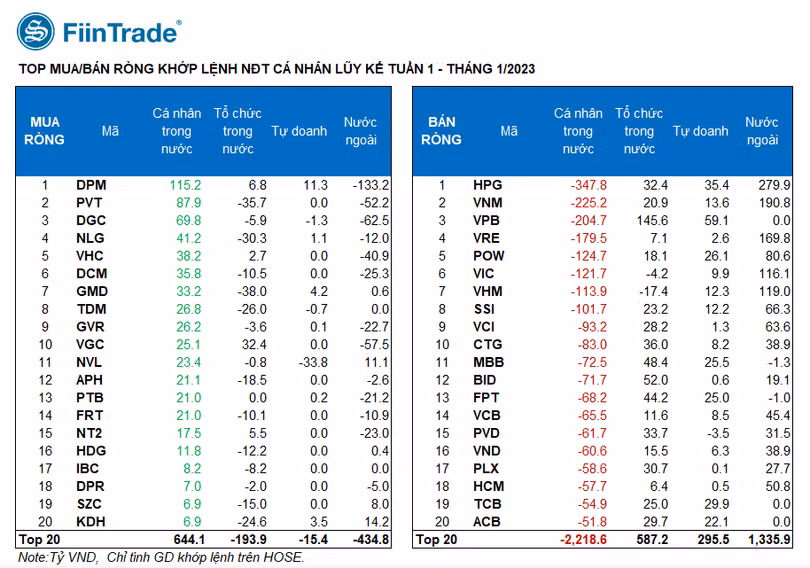 Trong tuần đầu tiên của năm 2023, bộ phận tự doanh các công ty chứng khoán cũng mua ròng 38 tỉ đồng. Tính riêng khớp lệnh họ mua ròng 372 tỉ đồng, tập trung ở các cổ phiếu VPB (+59,1 tỉ đồng), HPG (+35,4 tỉ đồng), POW (+26,1 tỉ đồng), MBB (+25,5 tỉ đồng).