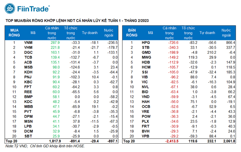 Trong tuần giao dịch 30/1-3/2, bộ phận tự doanh các công ty chứng khoán cũng bán ròng 282 tỉ đồng trên HOSE. Tính riêng giao dịch khớp lệnh họ bán ròng 64 tỉ đồng, tập trung vào các mã HPG (-56,6 tỉ đồng), SSI (-32,4 tỉ đồng), STB (-30,5 tỉ đồng), VHM (-21,7 tỉ đồng).