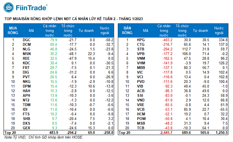 Đáng chú ý, nhà đầu tư cá nhân cũng chuyển mua ròng 1.404 tỉ đồng trên HOSE. Xét riêng giao dịch khớp lệnh họ bán ròng 2.633 tỉ đồng, chủ yếu bán ròng các mã HPG (-403,2 tỉ đồng), CTG (-216,7 tỉ đồng), STB (-204,2 tỉ đồng), VPB (-177,2 tỉ đồng), VNM (-162,5 tỉ đồng).