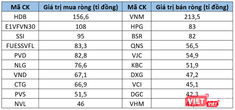 Trong đó, HDB là cổ phiếu được gom mạnh nhất với giá trị mua ròng đạt 156,6 tỉ đồng. Theo sau là E1VFVN30 (108 tỉ đồng), SSI (95 tỉ đồng), FUESSVFL (83,3 tỉ đồng) và PVD (82,8 tỉ đồng).
