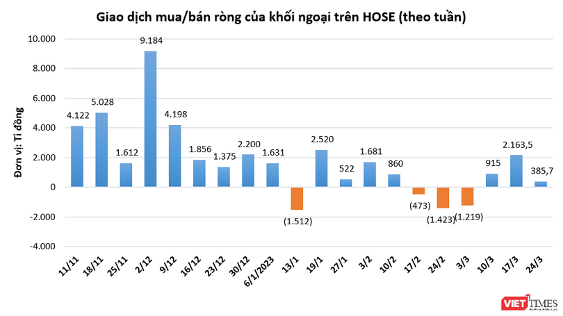 Khối ngoại duy trì mua ròng trong tuần vừa qua, song giá trị giao dịch giảm so với tuần trước. Cụ thể, họ mua ròng 6.948,5 tỉ đồng trên HOSE và bán ra 6.562,8 tỉ đồng, tương ứng giá trị mua ròng 385,7 tỉ đồng.