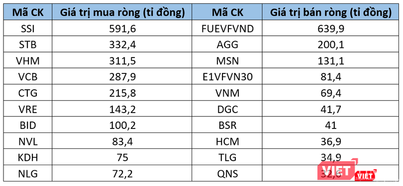 SSI là cổ phiếu được khối ngoại mua ròng nhiều nhất với giá trị đạt 591,6 tỉ đồng. Đáng chú ý, các nhà đầu tư nước ngoài mua ròng SSI phiên thứ 13 liên tiếp với tổng giá trị là 974 tỉ đồng.