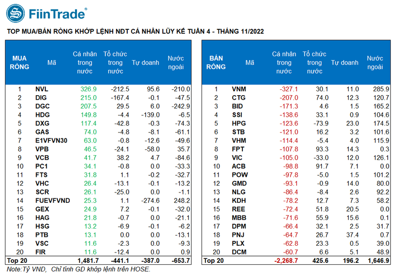 Trong tuần từ 21/11 – 25/11, nhà đầu tư cá nhân tiếp tục bán ròng với giá trị 1.697 tỉ đồng trên HOSE. Tính riêng giao dịch khớp lệnh họ bán ròng 1.555 tỉ đồng, tập trung vào các mã VNM (-327,1 tỉ đồng), CTG (-207 tỉ đồng), BID (-171,3 tỉ đồng), SSI (-138,6 tỉ đồng), HPG (-123,6 tỉ đồng).