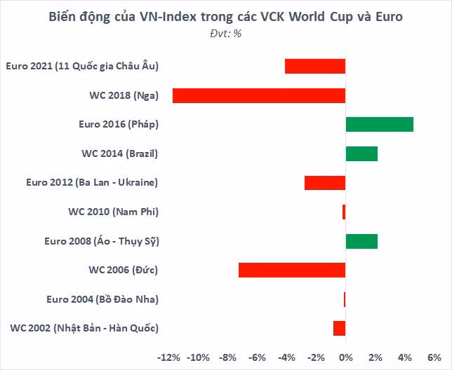 Từ khi đi vào hoạt động tháng 7/2000, TTCK Việt Nam đã trải qua tổng cộng 10 VCK World Cup và Euro với xác suất giảm điểm lên đến 70%. Trong đó, VN-Index đã giảm 4/5 mùa World Cup đã gần nhất và chỉ tăng duy nhất trong thời gian diễn ra World Cup 2014 tại Brazil.