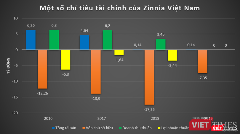 Tính đến cuối năm 2019, tổng tài sản của Zinnia Việt Nam vẫn đạt 0,14 tỷ đồng, vốn chủ sở hữu chỉ còn âm 7,35 tỷ đồng.
